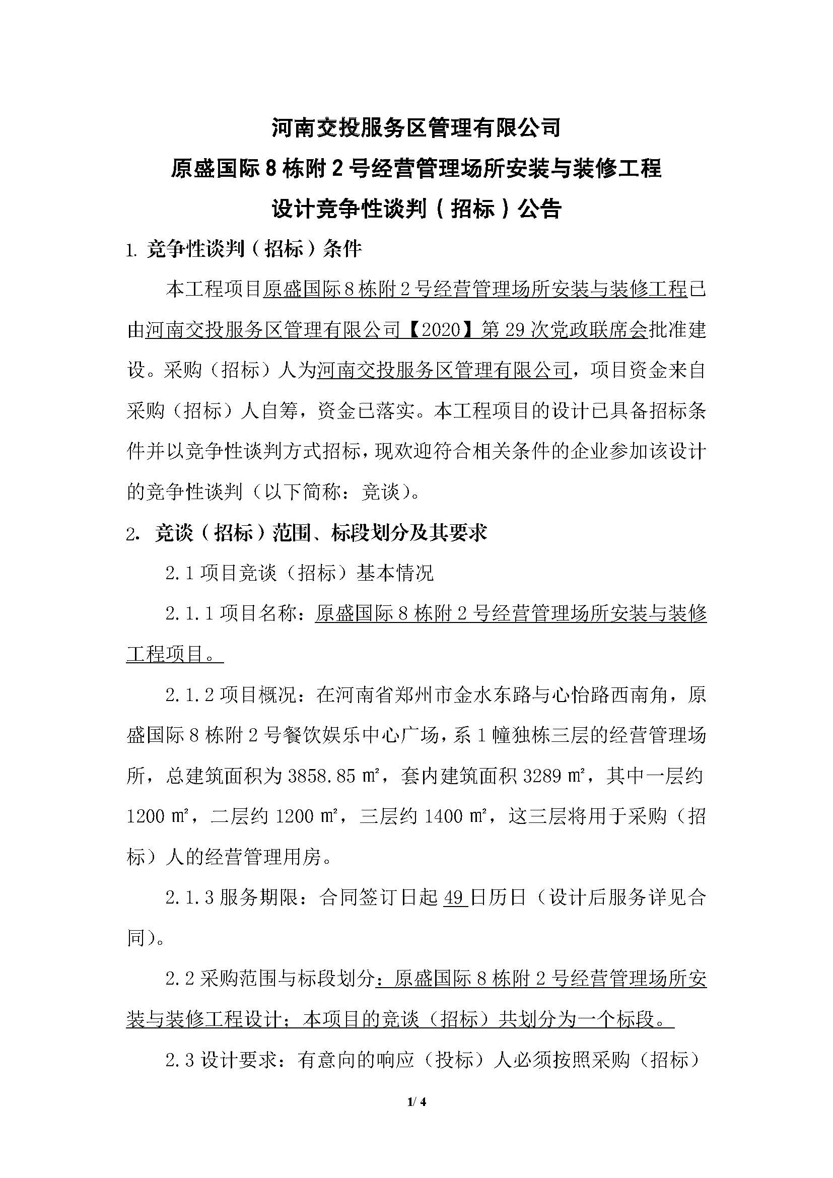 本工程項目原盛國際8棟附2號經營管理場所安裝與裝修工程已由河南交投服務區管理有限公司【2020】第29次黨政聯席會批準建設。采購(招標)人為河南交投服務區管理有限公司,項目資金來自采購(招標)人自籌,資金已落實。本工程項目的設計已具備招標條件并以競爭性談判方式招標,現歡迎符合相關條件的企業參加該設計的競爭性談判(以下簡稱:競談)。