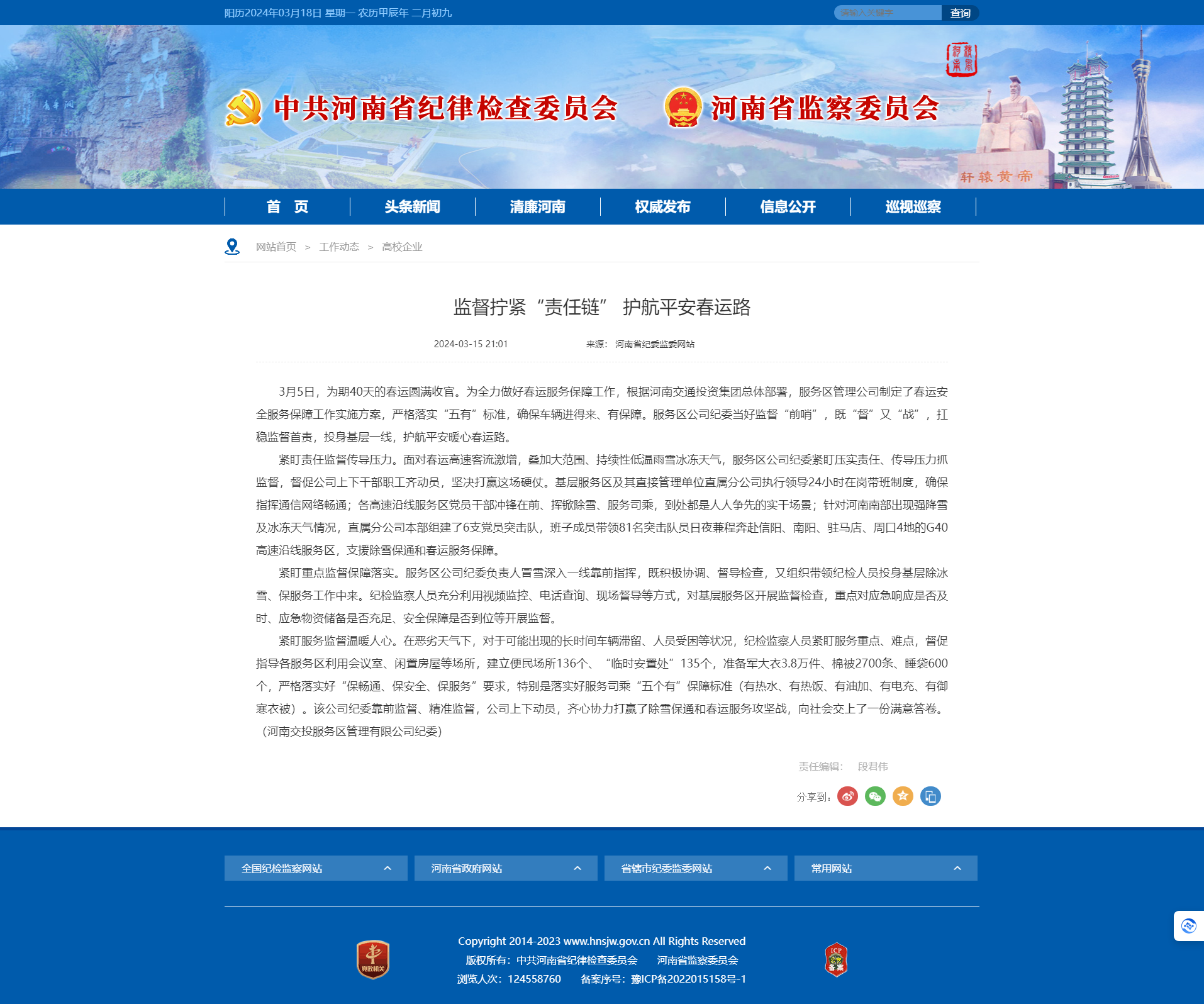 來源: 本站 發布時間: 2024-03-183月15日,河南省紀委監委外網工作動態板塊高校企業專欄刊載了服務區公司紀委春運監督工作信息《監督擰緊“責任鏈” 護航平安春運路》。