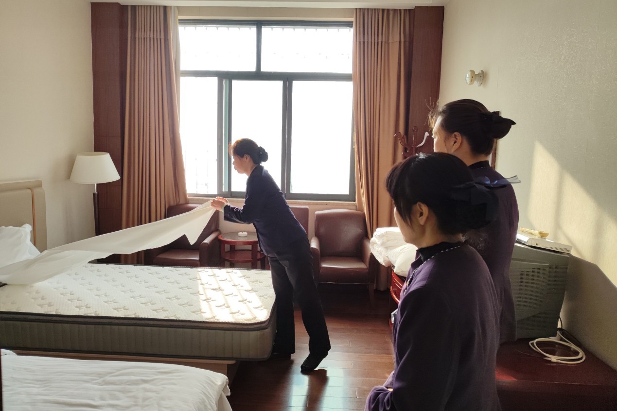 鄭州西服務(wù)區(qū)組織開展“客房標準化做床作業(yè)”培訓(xùn)