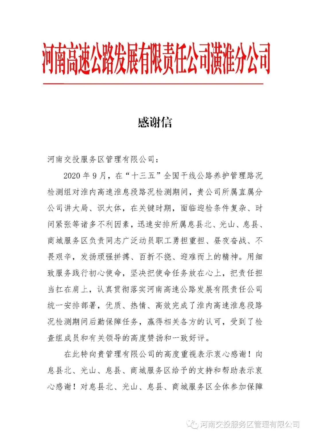 來源: 本站 發(fā)布時(shí)間: 2020-09-30近日,高發(fā)公司潢淮分公司給公司發(fā)來《感謝信》,感謝公司所屬直屬分公司在2020 年 9 月“十三五”全國干線公路養(yǎng)護(hù)管理路況檢測組對(duì)淮內(nèi)高速淮息段路況檢測期間,講大局、識(shí)大體,所屬息縣北、光山、息縣、商城服務(wù)區(qū)負(fù)責(zé)同志勇?lián)負(fù)?dān)、晝夜奮戰(zhàn)、不畏艱辛,優(yōu)質(zhì)、熱情、高效…