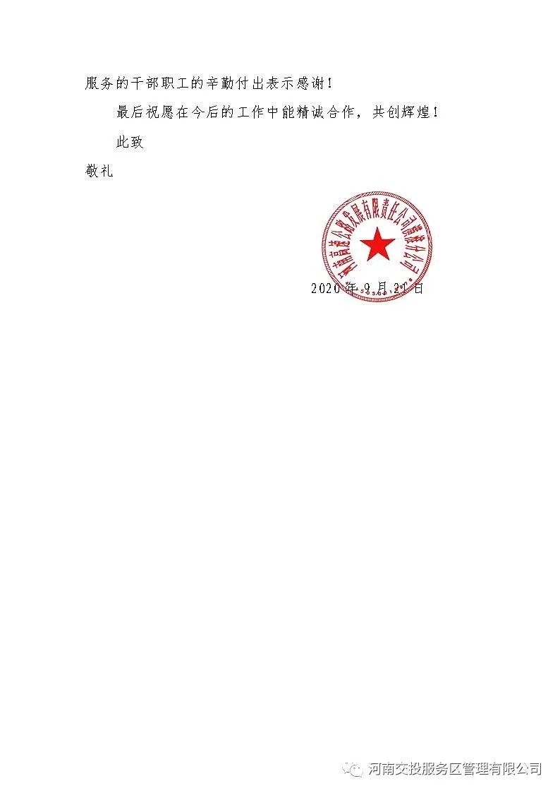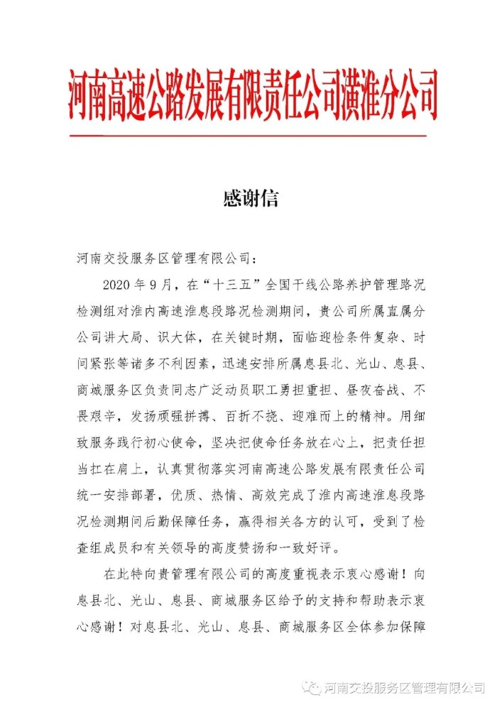 近日,高發(fā)公司潢淮分公司給公司發(fā)來《感謝信》,感謝公司所屬直屬分公司在2020 年 9 月“十三五”全國干線公路養(yǎng)護(hù)管理路況檢測(cè)組對(duì)淮內(nèi)高速淮息段路況檢測(cè)期間,講大局、識(shí)大體,所屬息縣北、光山、息縣、商城服務(wù)區(qū)負(fù)責(zé)同志勇?lián)負(fù)?dān)、晝夜奮戰(zhàn)、不畏艱辛,優(yōu)質(zhì)、熱情、高效完成了淮內(nèi)高速淮息段路況檢測(cè)期間后勤保障任務(wù),贏得相關(guān)各方的認(rèn)可,受到了檢查組成員和有關(guān)領(lǐng)導(dǎo)的高度贊揚(yáng)和一致好評(píng)。