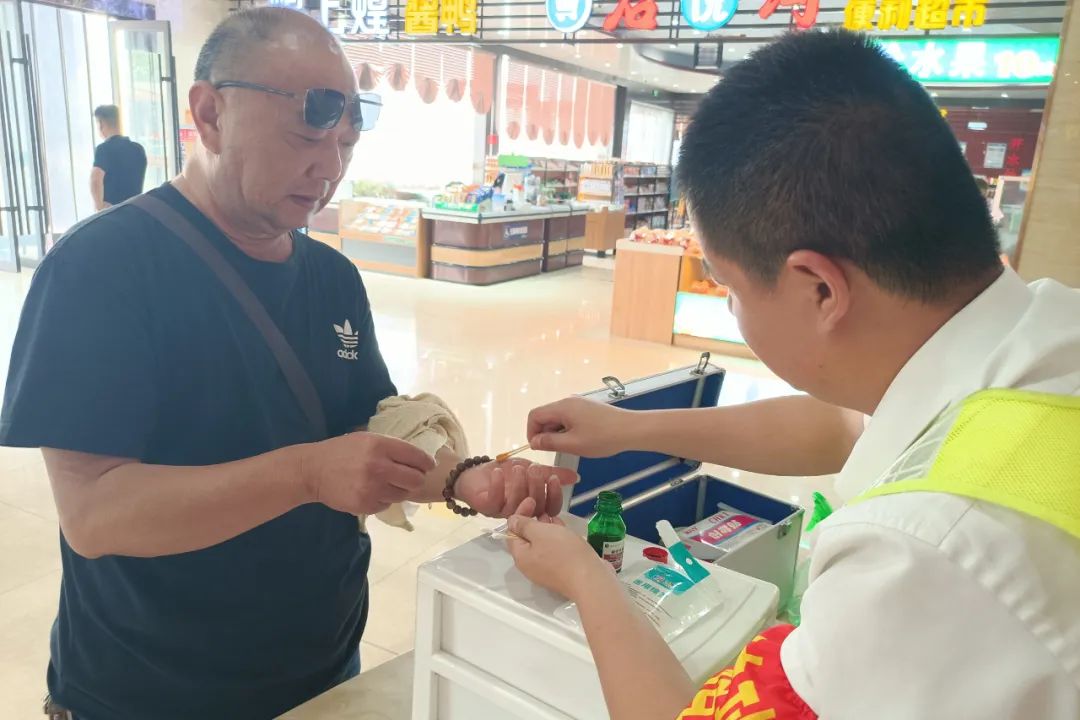 6月8日,封丘服務區為受傷司乘涂抹碘酒消毒