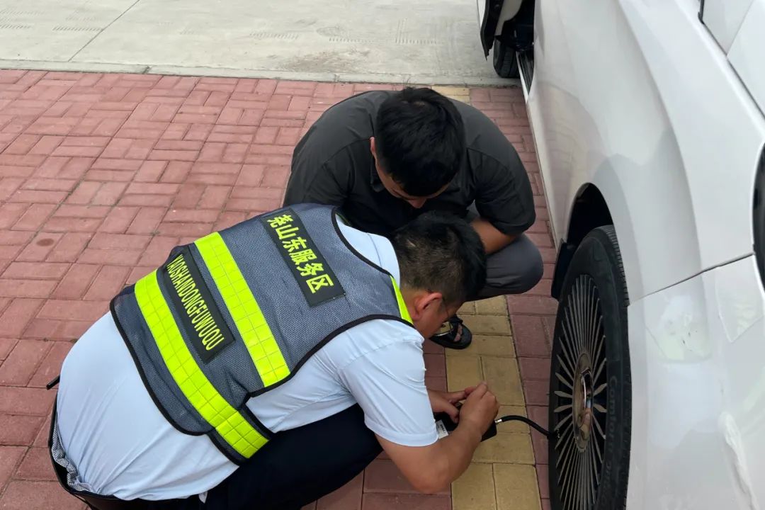 6月8日,堯山東服務區工作人員為司乘提供免費充氣服務