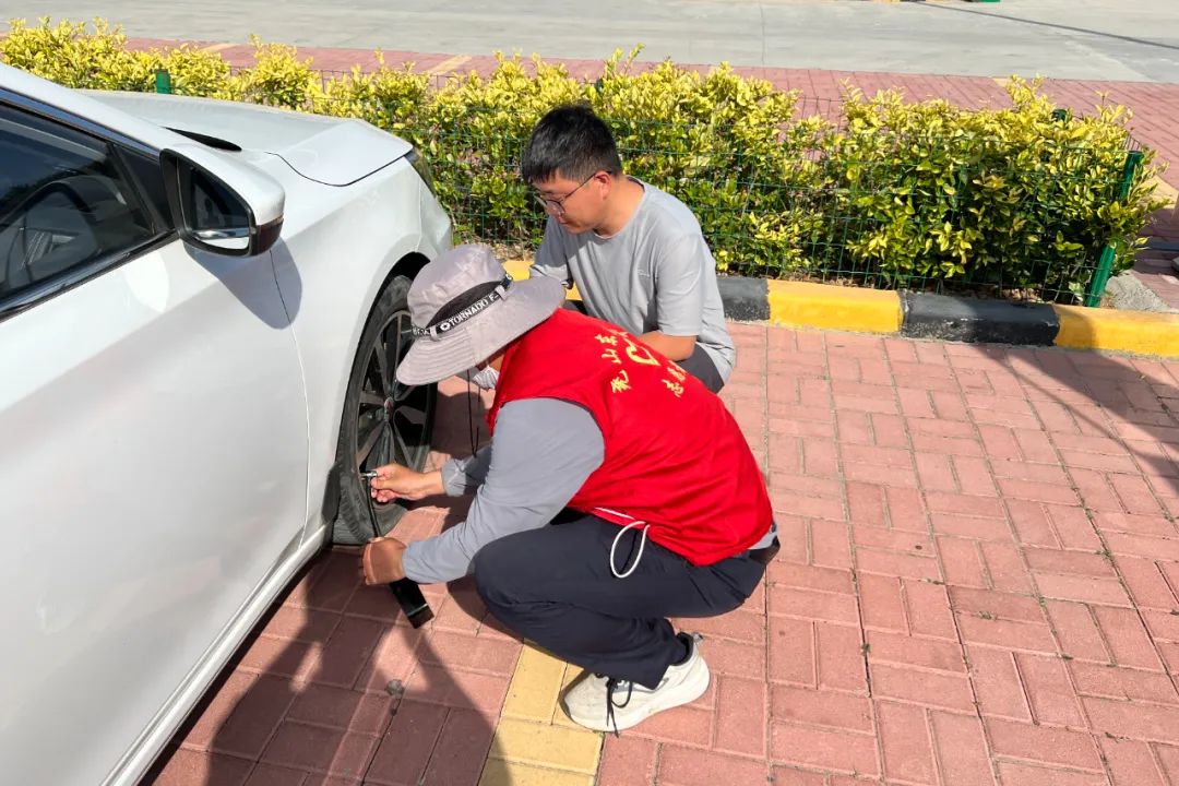 6月9日,堯山東服務區工作人員為故障車輛提供免費充氣服務