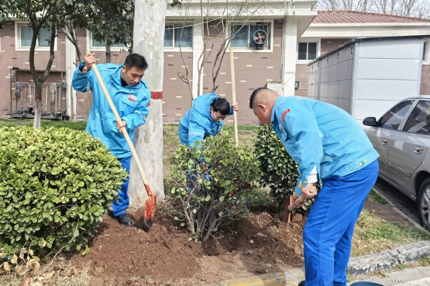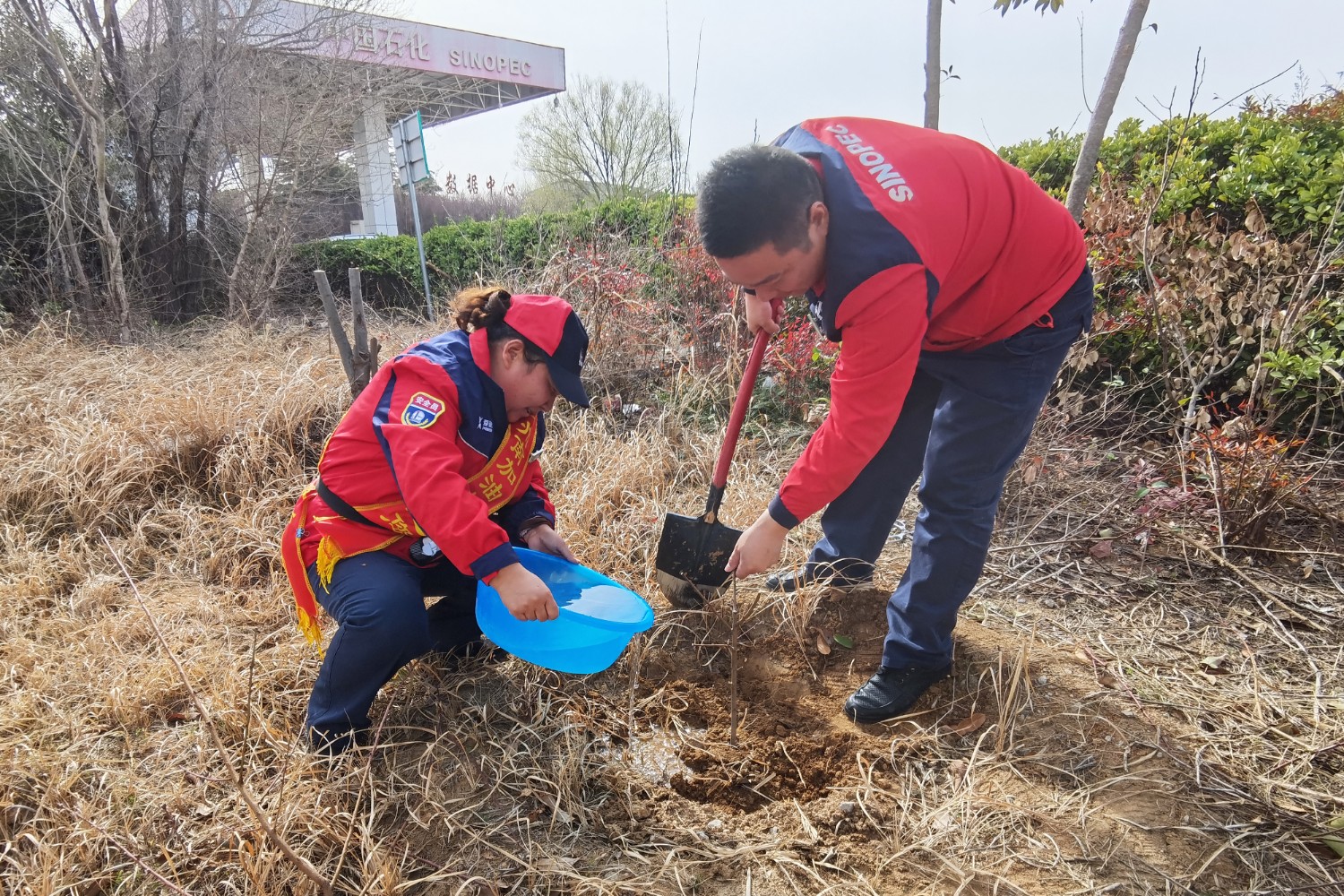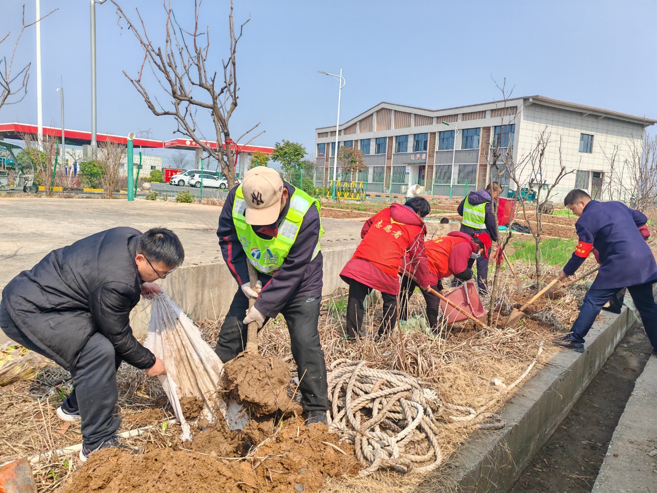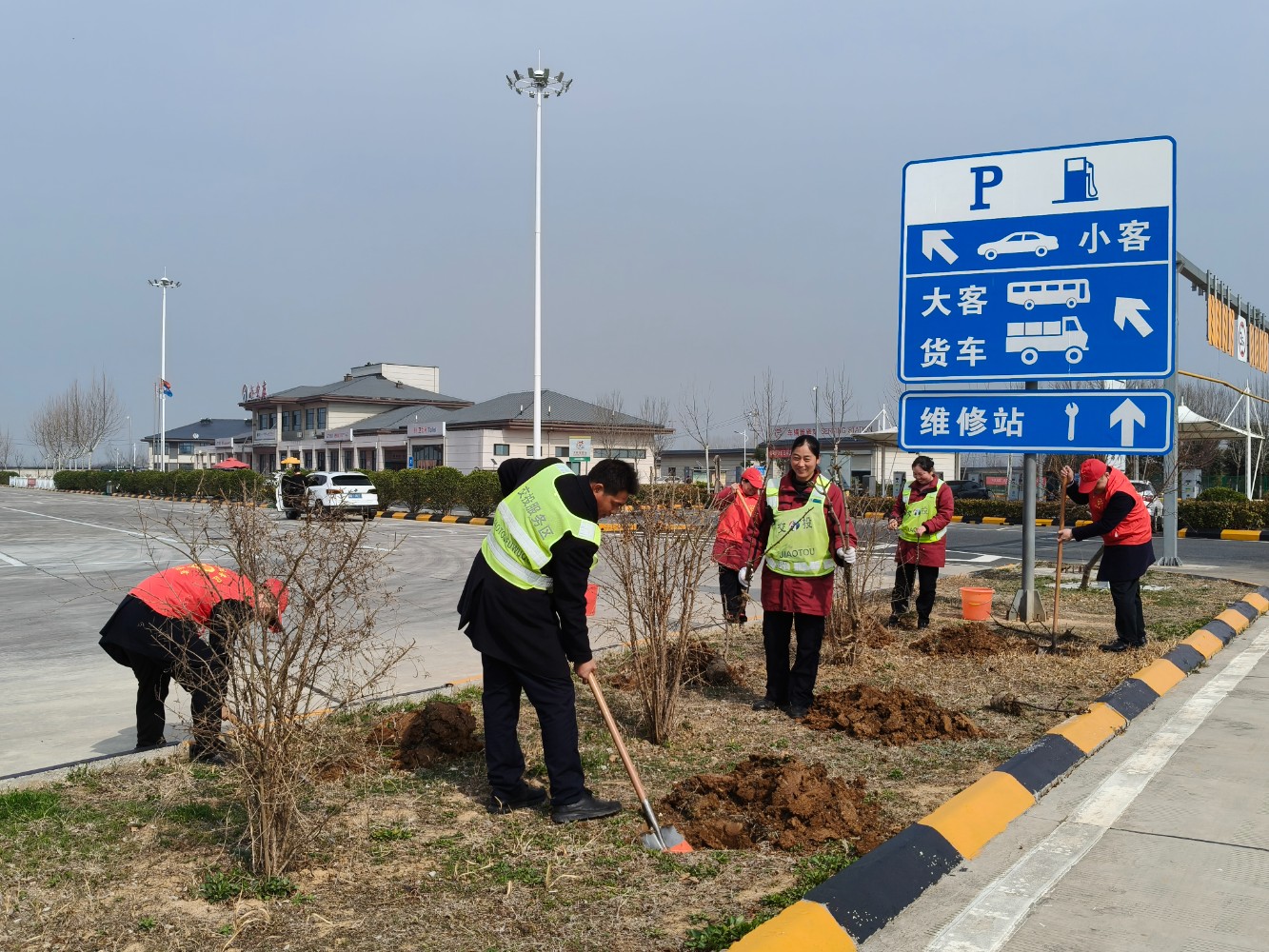 活動中,大家熱情高漲、干勁十足,手持鋤頭、鐵鏟、水桶等工具,有的揮鍬鏟土,有的扶苗填坑,將一棵棵樹苗植入泥土,現場一片熱火朝天的繁忙景象。經過一番精心勞作,一棵棵新栽種的樹苗迎風而立,為初春的服務區增添了勃勃生機的綠意。本次活動有效提升了大家植綠、護綠、愛綠的意識,美化充實了員工生活,下一步,公司將持續秉承綠色發展理念,持續關注生態環境保護,積極開展各類環保活動,為過往司乘安全健康出行保駕護航。
