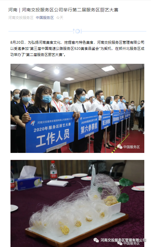 8月21日,中國公路網、中國服務區分別以題為《河南交投服務區管理公司成功舉辦“首屆河南交投服務區820美食品鑒會”暨第二屆服務區廚藝大賽》《河南 | 河南交投服務區公司舉行第二屆服務區廚藝大賽》對公司美食品鑒會暨廚藝大賽活動情況進行了報道。