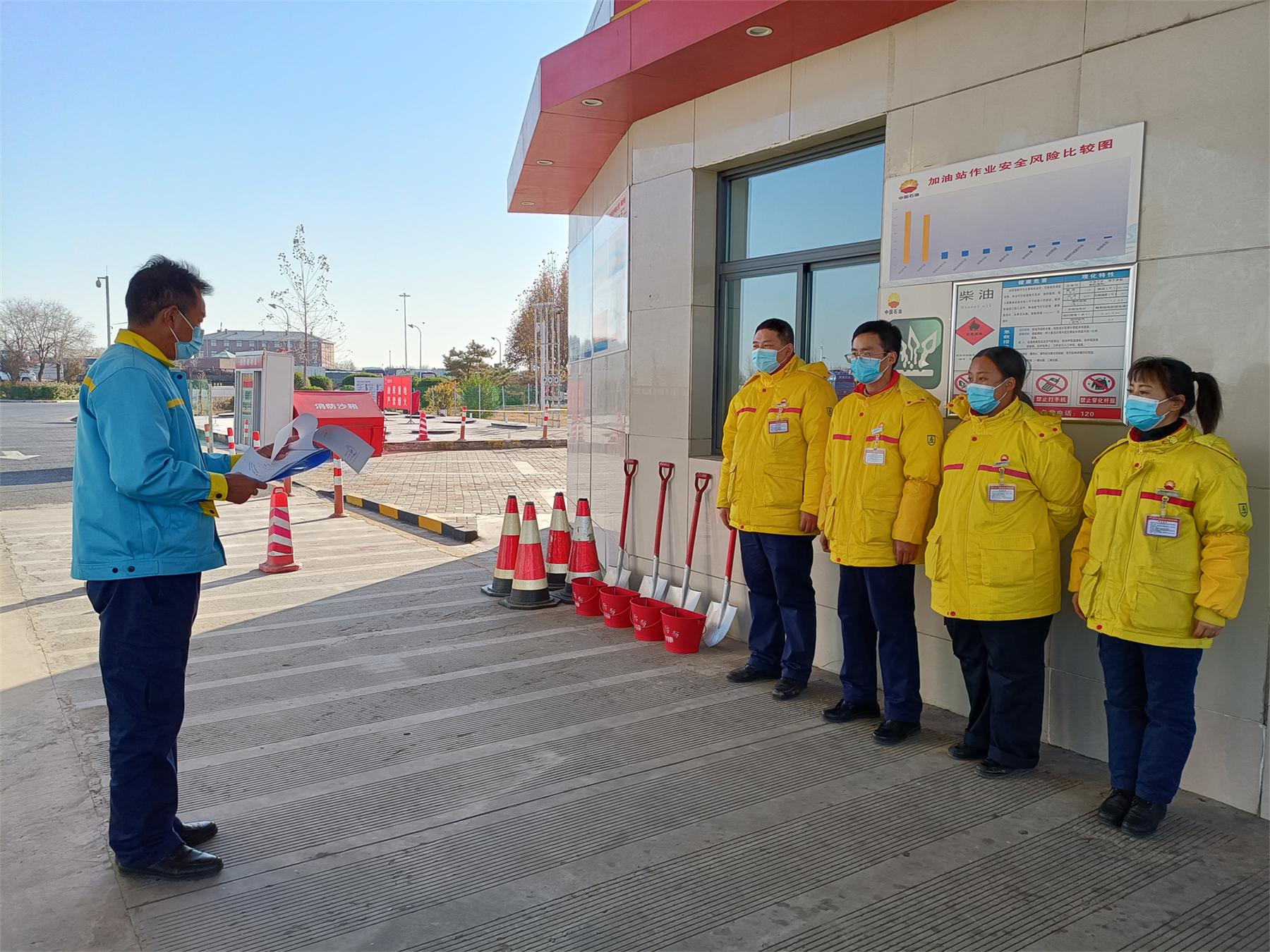 高速石化公司:一是組織站內員工聯合服務區進行除雪保通應急措施演練,確保司乘安全進出加油站。二是密切關注天氣變化,當發生暴雪、冰凍等氣象災害時,立即啟動預案。站內員工在不影響儀表著裝的前提下要注意保暖,防止凍傷。三是對站內的供水管、輸油管線、加油機、進行保暖防護,在營業室、站房、洗手間室外臺階和加油島鋪上防滑墊,確保人員上下臺階行走安全。四是部署安全員、核算員對加油區、油罩棚、警示牌等露天設備和外部電纜電線進行排查,做好融冰工作,為過往車輛提供安全的服務環境。五是加強員工思想教育,提高防凍、防滑安全意識,確保員工生活、工作、出行安全相統一。