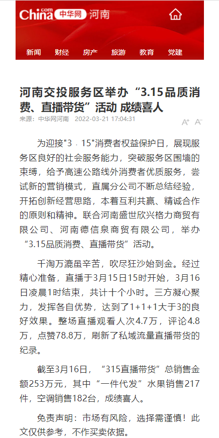 2022年3月21日,中華網(wǎng)、中原網(wǎng)以題為《河南交投服務(wù)區(qū)舉辦“3.15品質(zhì)消費、直播帶貨”活動成績喜人》對服務(wù)區(qū)公司直屬分公司直播帶貨活動進(jìn)行報道。