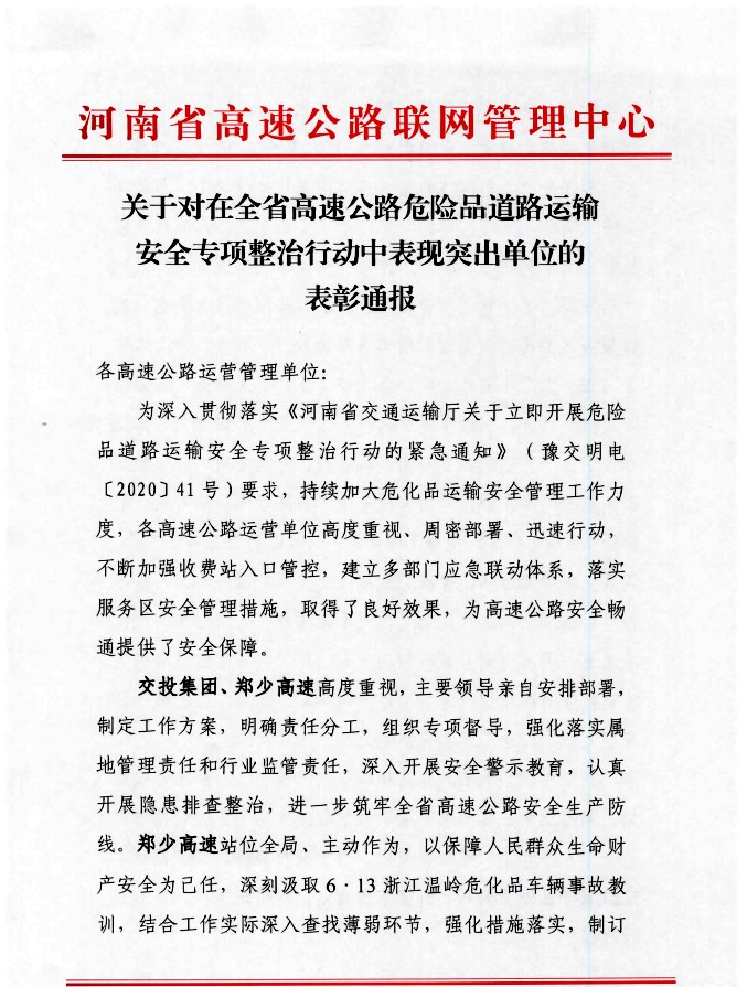 來源: 本站 發(fā)布時(shí)間: 2020-07-02近期,公司在全省高速公路危險(xiǎn)品道路運(yùn)輸安全專項(xiàng)整治活動(dòng)中表現(xiàn)突出,省高速公路聯(lián)網(wǎng)管理中心對公司高度重視、周密部署,多舉措抓好抓實(shí)安全生產(chǎn)工作,給予了充分肯定,并對交投集團(tuán)、公司及所屬鄭州北服務(wù)區(qū)全省通報(bào)表彰! 6月24日,河南省政府副省長、省公安廳廳長舒慶一行…