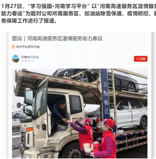 “學習強國·河南學習平臺”對公司所屬服務區、加油站開展除雪保通、疫情防控、服務保障工作進行宣傳報道