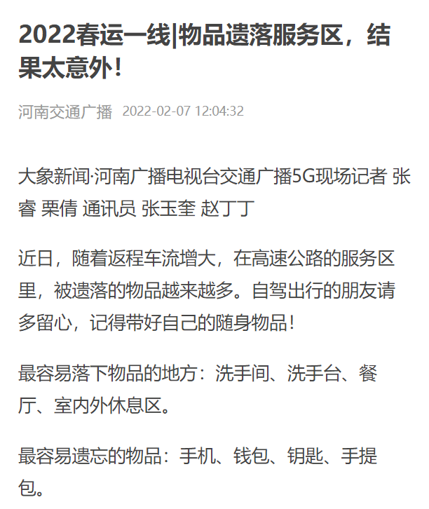 大象新聞、今日頭條、河南交通廣播:2022春運一線|物品遺落服務區,結果太意外!