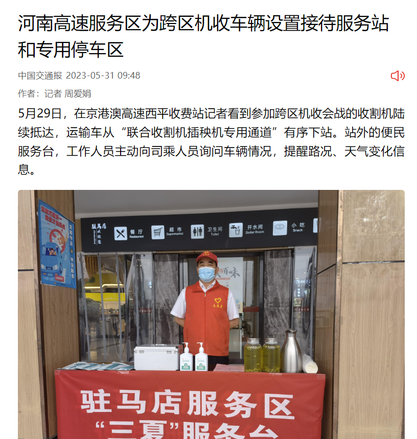 中國交通新聞網:河南高速服務區為跨區機收車輛設置接待服務站和專用停車區