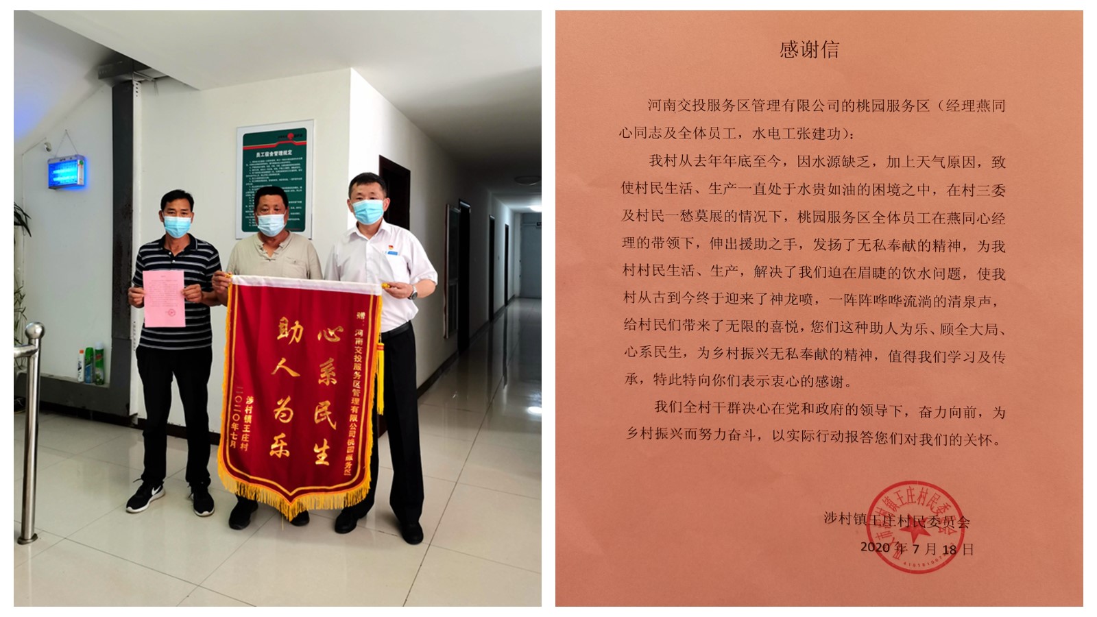 2020-07-22 作者:因天氣干旱,導致桃園服務區所處地王莊村和北坡村共計1200余口村民和牲畜的生活用水出現問題。天災無情人有情,患難之處見真情。桃園服務區經理了解到旱情后,充分發揮黨員先進性,服務區伸出援助之手,及時對災情村莊提供生產生活用水長達半年,解決了村民用水的燃眉之急,此…