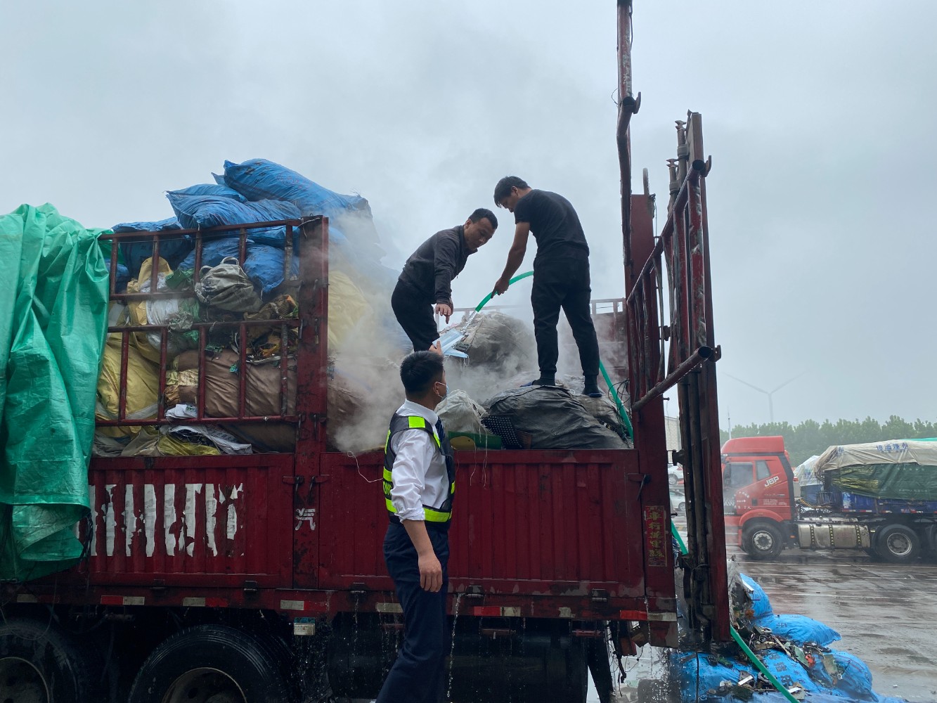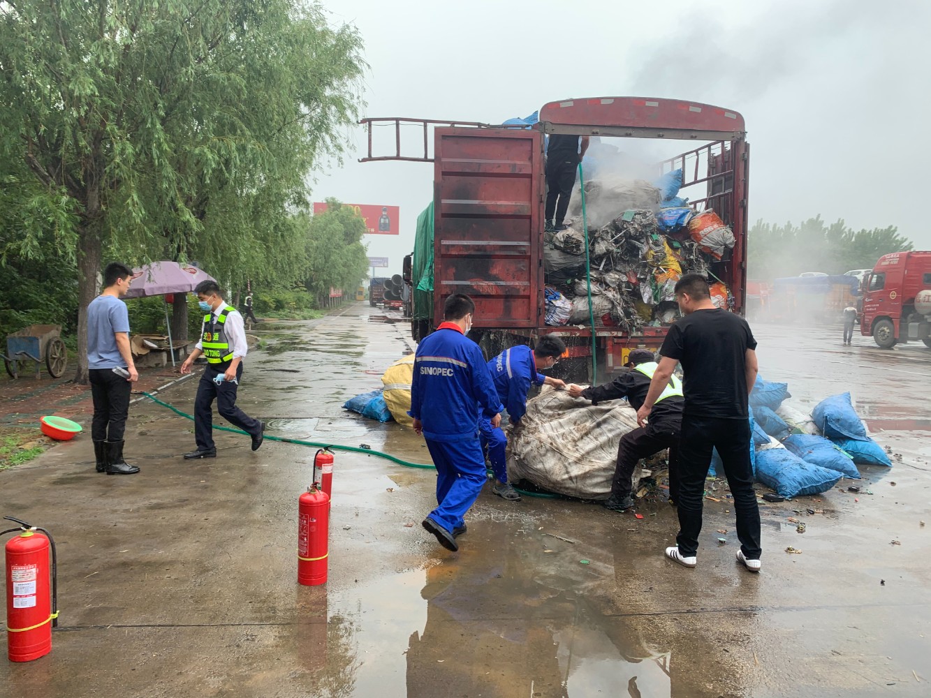 5月14日,漯河服務區(qū)監(jiān)管人員發(fā)現(xiàn)一輛冒出濃濃黑煙、滿載廢舊電子材料的貨車行駛到服務區(qū)西區(qū)廣場。因自燃車輛距離加油站不足百米,為避免更大險情,服務區(qū)監(jiān)管人員立即啟動應急預案,引導車輛停靠在指定位置,召集加油站員工、交通疏導員等攜帶各類滅火器具趕至現(xiàn)場,同時撥打119電話報警。